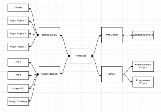 The information architecture uses a tree hierarchy across four sections: a personal introduction, the Design Studio project documentation, a Graphic Design gallery, and a Web Design case study. This structure was chosen for its clarity and scalability — the site was intended to grow as new work was added over time.